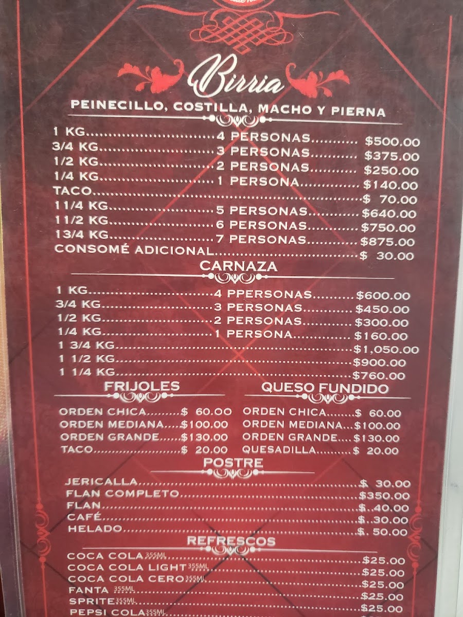 Peinecillo, costilla, macho, pierna, 500 gr tortillas de maíz 100 gr, consomé de birria 250 ml y chile de la casa, para 2 personas.